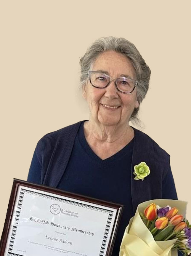 On behalf of Ethel Warbinek and board members, I am pleased to nominate Lenore Radom for Honourary Membership with the British Columbia History of Nursing Society. Lenore has been a longstanding member of the board in various positions, and lately as Vice-President and Chair of the Website Committee.